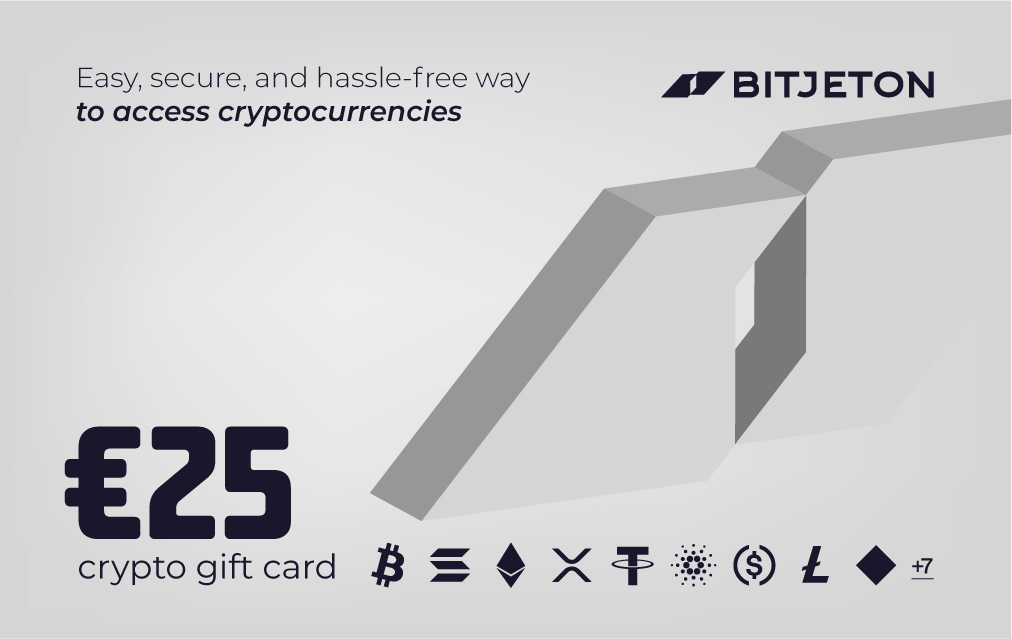 Eine BitJeton-Geschenkkarte im Wert von 25 € ist ein Gutschein mit einem Wert von 25 Euro – ideal, um klein anzufangen und Kryptowährungen zu nutzen. Sie können eine BitJeton-Geschenkkarte schnell, einfach und sicher verwenden, um bekannte Kryptowährungen wie Bitcoin oder Ethereum zu kaufen. Alles, was Sie tun müssen, ist, einen einzigartigen BitJeton-Code in unserem Webshop zu kaufen, und Sie können das Guthaben sofort in Ihrer sicheren digitalen BitJeton-Brieftasche verwenden.
