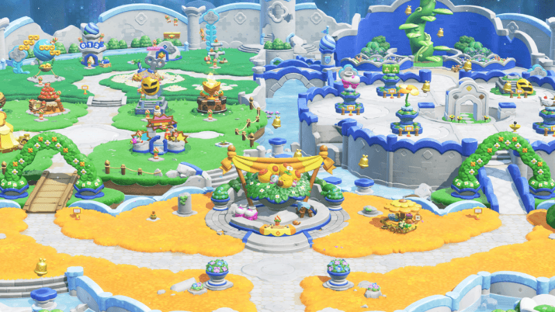 In diesem Bereich des Bellabel-Parks gibt es jede Menge Mehrspielerspaß zu entdecken! Die Lokales-Spiel-Plaza bietet 17 Attraktionen, bei denen bis zu vier Spieler gemeinsam oder gegeneinander antreten können – und das auch über GameShare! Wer lieber online oder über den drahtlosen lokalen Modus mit Freunden und Familie spielen möchte, kann dies auf der Spielraum-Plaza tun. Hier können bis zu 12 Spieler sechs verschiedene Attraktionen miteinander oder gegeneinander erleben.