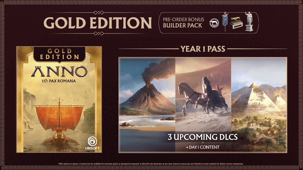 - Anno 117: Pax Romana, Year 1 Season Pass – Een jaar lang allerlei add-ons voor de basisgame. Deze pass kan je niet gebruiken als je niet in het bezit bent van de basisgame.