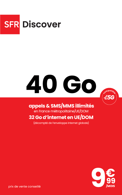 SFR Discover sont les forfaits prépayés SFR de l'un des plus grands fournisseurs de télécommunications en France, SFR. Avec cet opérateur, vous utilisez votre forfait non seulement chez vous, mais aussi dans d'autres régions d'Europe et d'Afrique. Cet opérateur est un géant de la téléphonie mobile, de la téléphonie fixe, de l'internet (local et mobile) et de la télévision. Cette société possède le deuxième réseau mobile de France. SFR est connu pour sa bonne couverture dans les zones urbaines et pour ses forfaits mobiles SFR nationaux et internationaux généreux qui incluent l'itinérance européenne en standard. Les forfaits SFR sont également idéaux pour les expatriés et les personnes qui connaissent beaucoup de monde en dehors des frontières du pays, par exemple. C'est la meilleure solution si vous utilisez beaucoup votre smartphone mais que vous ne voulez pas d'abonnement.