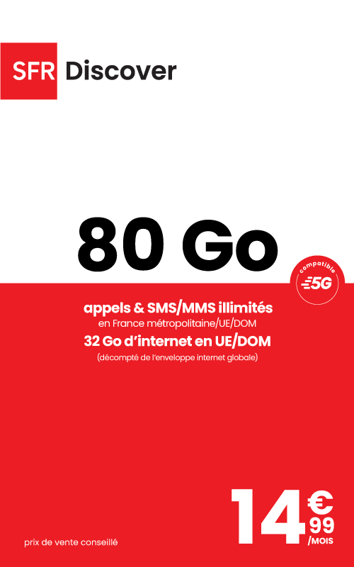 SFR Discover sont les forfaits prépayés SFR de l'un des plus grands fournisseurs de télécommunications en France, SFR (Société Française de Radiotéléphonie). Avec un forfait SFR 80 Go de cet opérateur, vous utiliserez largement votre forfait non seulement au niveau national, mais aussi dans d'autres parties de l'Europe et même en Afrique. Ce fournisseur de télécommunications est un acteur majeur de la téléphonie mobile et de l'internet. Il possède le deuxième réseau mobile de France. SFR est connu pour sa bonne couverture dans les zones urbaines et ses forfaits mobiles SFR nationaux et internationaux généreux. Les crédits prépayés SFR sont également idéaux pour les expatriés et les personnes qui souhaitent avoir de nombreux contacts à l'étranger, par exemple. C'est la meilleure solution pour les personnes qui ne veulent pas être liées à un abonnement.
