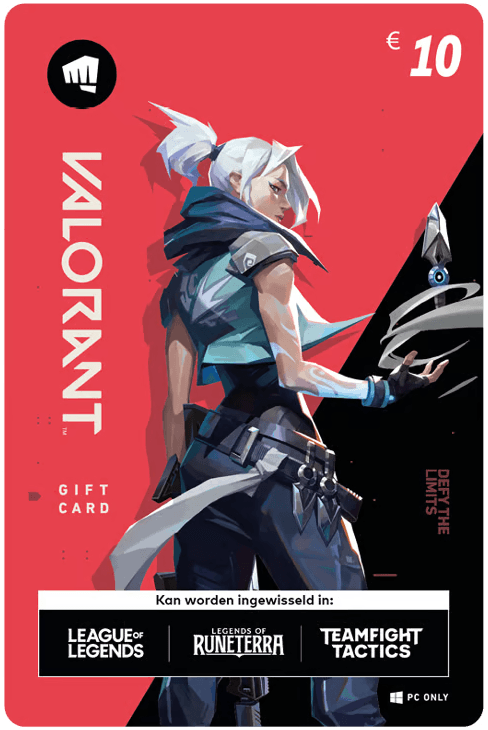 Valorant Gift Cards kunnen worden ingewisseld voor in-game credits in Valorant, maar ook in de volgende games: League of Legends, Legends of Runeterra en Teamfight Tactics. De enige manier om je Valorant Gift Card in te wisselen is via de officiële gameclient van de game waarin je geïnteresseerd bent. Zo kun je je code inwisselen voor Valorant Points: