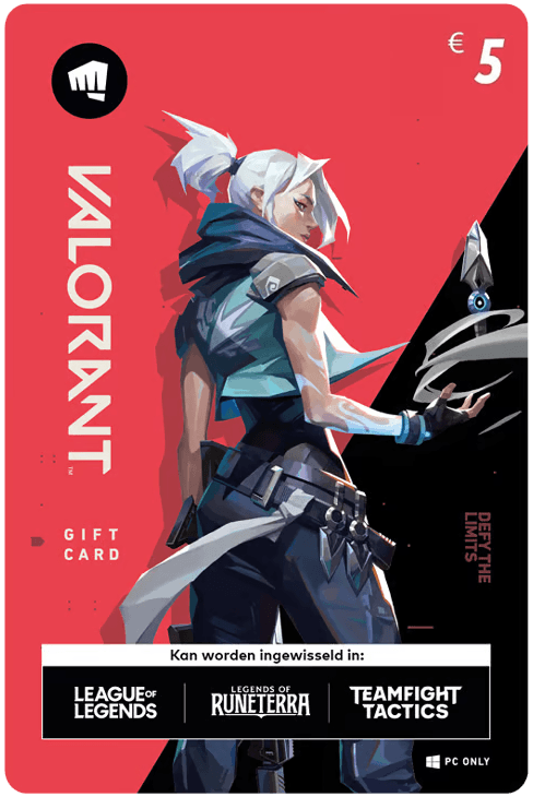 Valorant Gift Cards kunnen worden ingewisseld voor in-game credits in Valorant, maar ook in de volgende games: League of Legends, Legends of Runeterra en Teamfight Tactics. De enige manier om je Valorant Gift Card in te wisselen is via de officiële gameclient van de game waarin je geïnteresseerd bent. Zo kun je je code inwisselen voor Valorant Points: