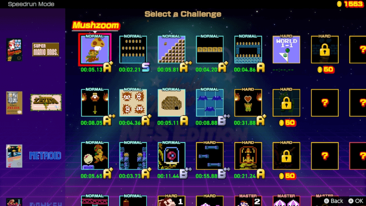 Stel jouw speedrunskills op de proef in meer dan 150 uitdagingen. Elke uitdaging is een stukje uit een van 13 NES-games, waaronder klassiekers zoals Super Mario Bros. 3, The Legend of Zelda, Donkey Kong en Metroid.